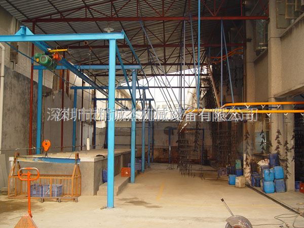 特点:利用电动葫芦将工件吊浸于处理槽完成工件表面的处理,结构简单投资少,适用于表面复杂生锈严重的工件,不适合漂浮工件。