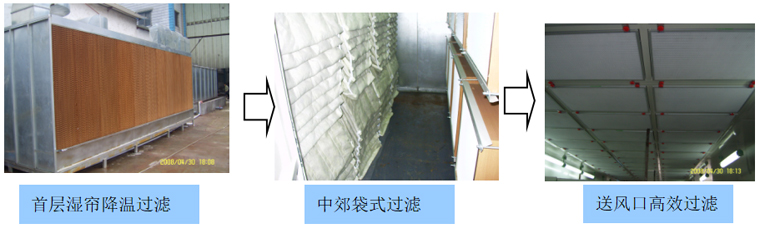 鲜风-湿帘降温除温-汽水分离-初效过滤器-袋式中效过滤器-有隔板中效过滤--风机-供风天井高效过滤器-涂装车间 ,可接净化等级要求配制过滤层数量与过滤精度